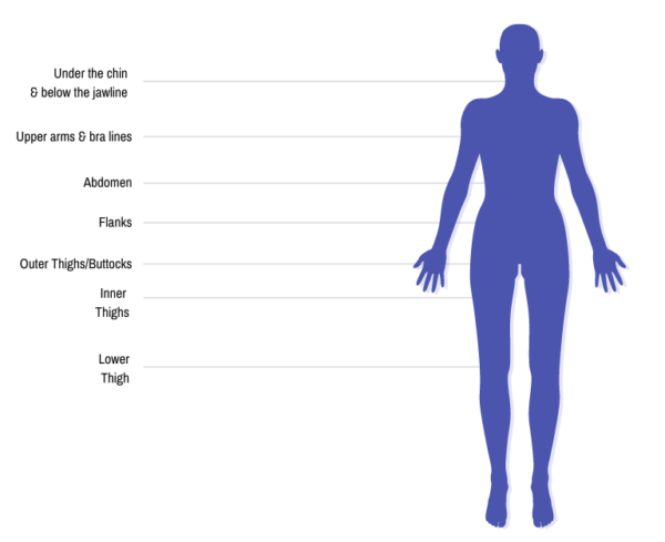 Full Face, Neck, Full Legs, Full Arms, Any Bikini (Brazilian/ Hollywood), Underarms, Perianal, Navel, Buttocks, Nipples, Full Back, Shoulders, Chest, Abdomen, Hands and Feet.